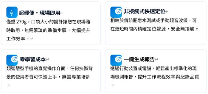 與傳統方法比較:相較於肥皂水測試、手持超音波探頭或熱像儀,US64S 提供更直觀的二維聲學圖像, 術人員在數秒內完成問題定位,顯著縮短檢測時間並提高準確性。